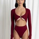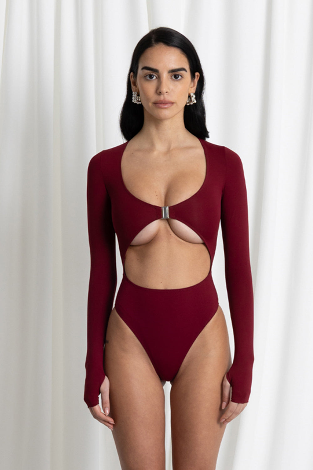 BODY CLIP BORDEAUX. Body in Microfibra italiana di altissima qualità dal design audace e moderno. La sua silhouette aderente esalta le curve in modo elegante, mentre lo scollo sul seno è impreziosito da un’elegante clip centrale in zama che aggiunge un tocco di stile distintivo e sofisticato.