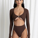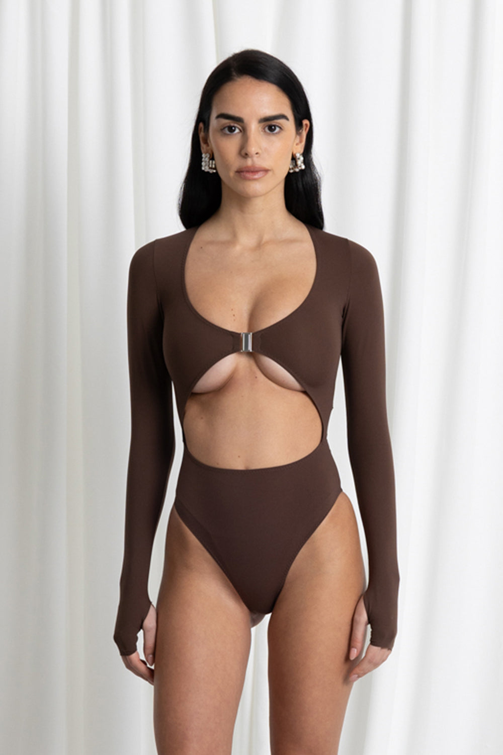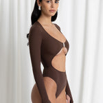 BODY CLIP CHOCOLATE. Body in Microfibra italiana di altissima qualità dal design audace e moderno. La sua silhouette aderente esalta le curve in modo elegante, mentre lo scollo sul seno è impreziosito da un’elegante clip centrale in zama che aggiunge un tocco di stile distintivo e sofisticato.