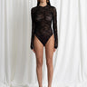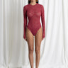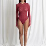 BODY PIZZO BORDEAUX. Un body elegante e sensuale, realizzato in pizzo elasticizzato che aderisce al corpo con un effetto seconda pelle. Le maniche lunghe e il motivo in pizzo creano un equilibrio perfetto tra romanticismo e modernità, mentre la trasparenza strategica aggiunge un tocco raffinato senza risultare eccessiva.
