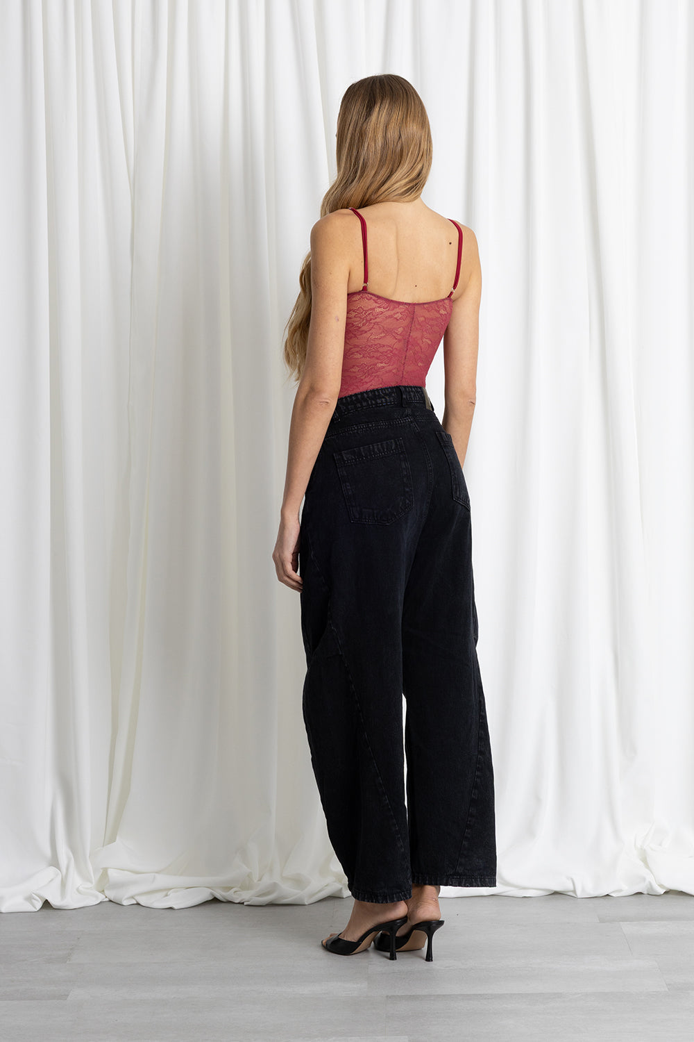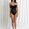 Le spalline sottili aggiungono delicatezza al design, mentre il corpo in pizzo trasparente crea un contrasto sensuale e sofisticato. Il taglio alto sui fianchi slancia visivamente la figura e rende il capo ancora più elegante.