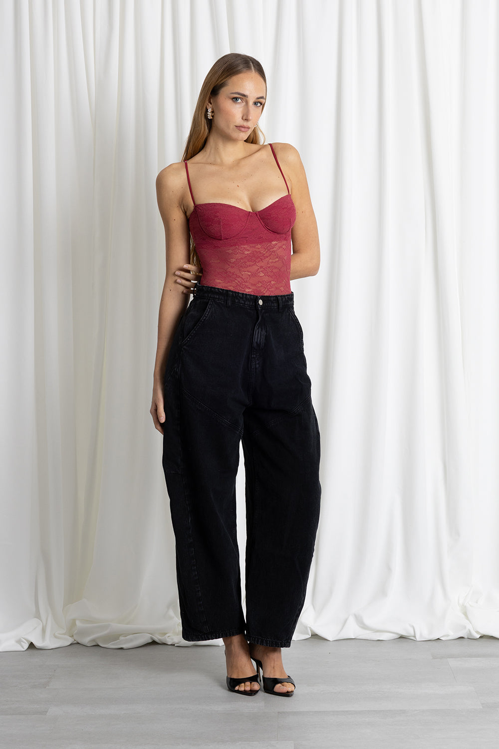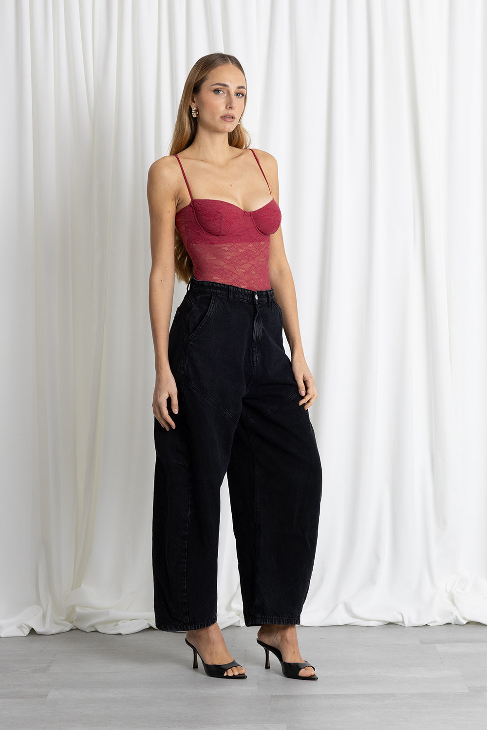 BODY PIZZO FERRETTO BORDEAUX. Un body raffinato e femminile, realizzato in pizzo elasticizzato che scolpisce la silhouette con leggerezza. La parte superiore presenta coppe strutturate, pensate per valorizzare il décolleté con un sostegno naturale e una forma pulita.