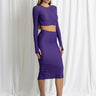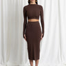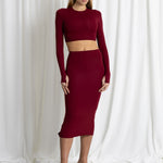Il top crop a maniche lunghe ha un taglio essenziale che sottolinea la zona del punto vita in modo elegante e moderno. La gonna lunga a vita alta completa il look con una silhouette dritta e affusolata che scende fluida, creando un effetto visivamente slanciato.