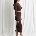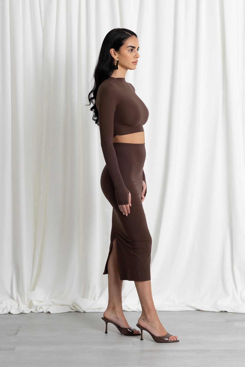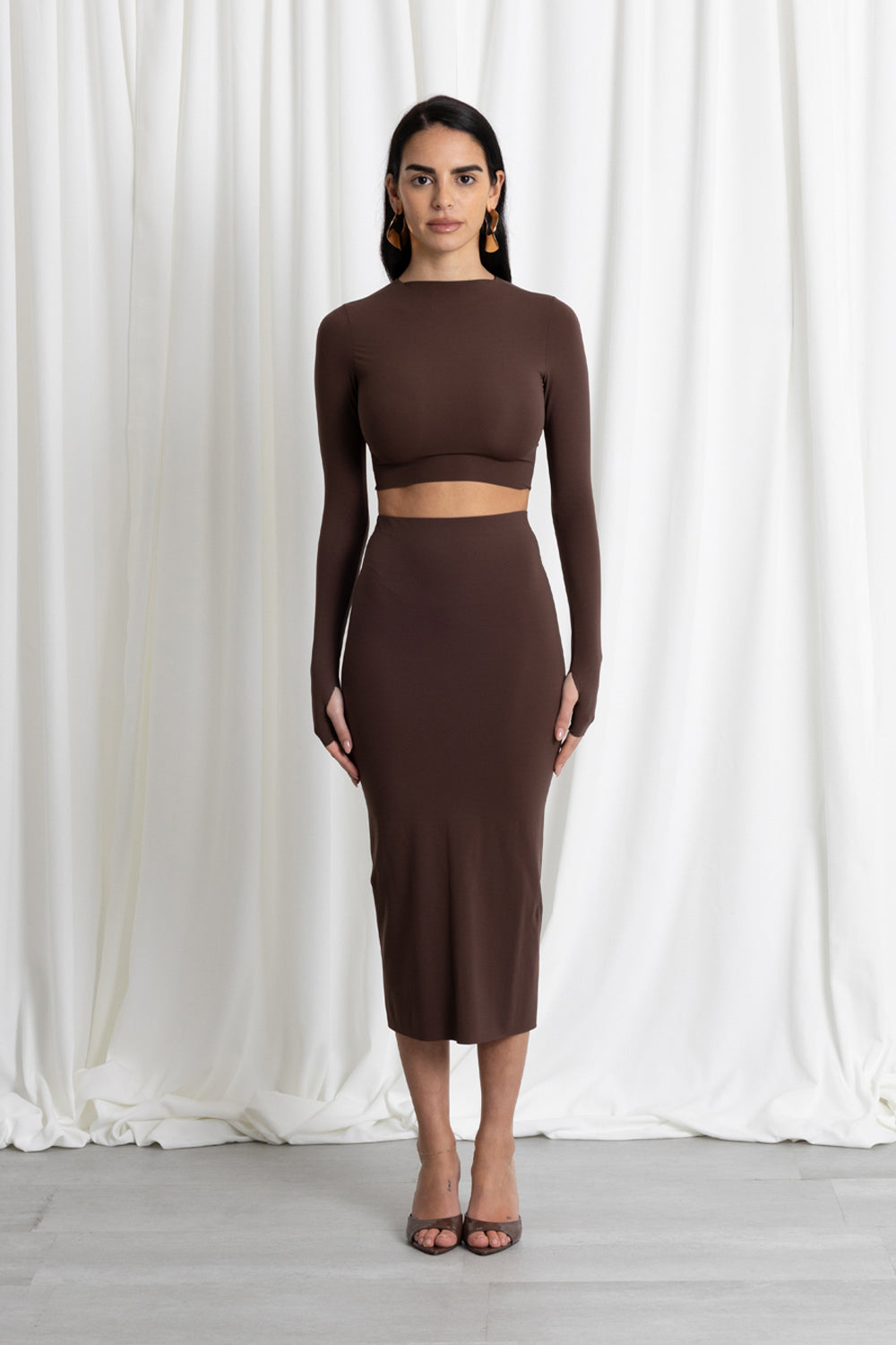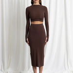 Il top crop a maniche lunghe ha un taglio essenziale che sottolinea la zona del punto vita in modo elegante e moderno. La gonna lunga a vita alta completa il look con una silhouette dritta e affusolata che scende fluida, creando un effetto visivamente slanciato.