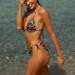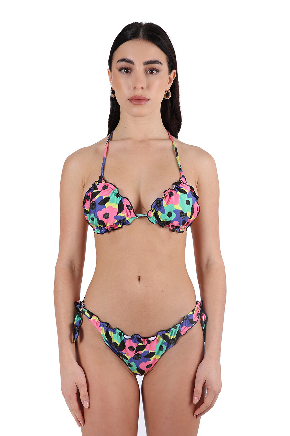 The Triangle has preformed and removable cups thanks to the internal eyelet through which the cups can be removed or replaced with others as desired, it is adjustable at the chest, depending on the need, thanks to the lace-up closure behind the back.