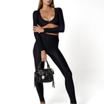 CLIP TOP AND LEGGINGS COMPLETE. Discover our lycra set, made with passion in Italy, consisting of high-waisted leggings and a long-sleeved crop top. The leggings hug the silhouette perfectly, offering a comfortable and slimming fit, while the high waist ensures support and comfort. The crop top features an elegant central zama clip that adds a touch of distinctive and modern style. It is suitable for multiple occasions, perfect for an elegant evening or for an informal outing with a touch of class. Choose Italian quality and let yourself be enveloped by the beauty of a contemporary and sophisticated design!