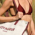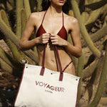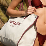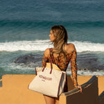 The Sontèn bag is roomy and super glam for going to the beach. It is made of canvas with zip closure and internal pocket.